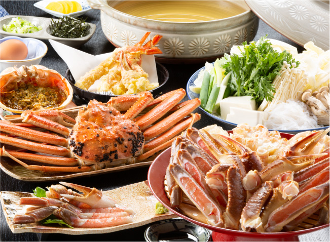 大人気のカニ甲羅味噌炭火焼きや茹でガニが付いています。 焼き、刺し、天ぷら、鍋と、多種多様なカニの味をお楽しみください。